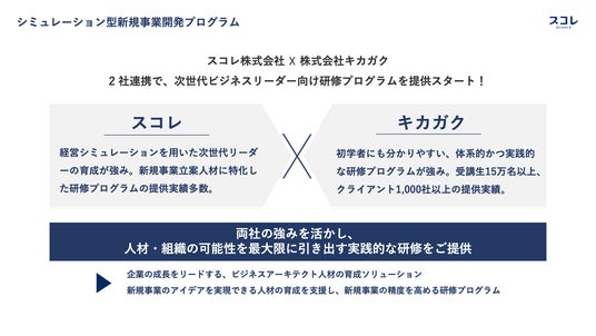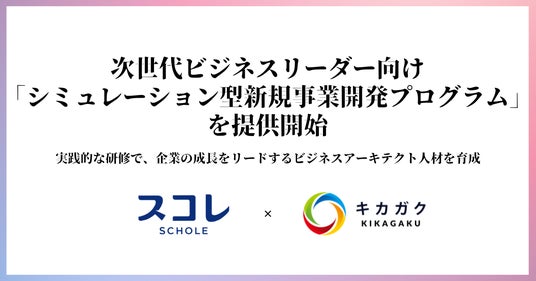 経営シミュレーションを活用した次世代リーダー育成に取り組むスコレ株式会社(本社:東京都新宿区、代表取締役:須藤 奨、以下「スコレ」)は、AI・機械学習を含めた先端技術に関する教育事業を展開する株式会社キカガク(本社:東京都渋谷区、代表取締役社長:大崎 将寛、以下「キカガク」)と共同で、両社の強みを活かした次世代ビジネスリーダー向けの「シミュレーション型新規事業開発プログラム」を開発、提供を開始しました。