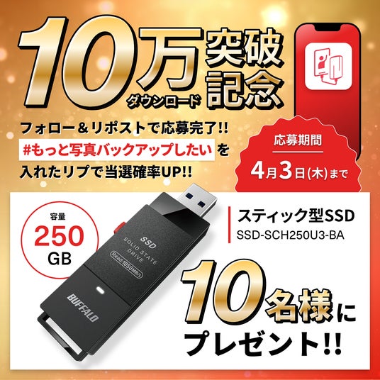 メルコホールディングス(東・名 6676)グループの株式会社バッファロー(本社:名古屋市、代表取締役社長:牧 寛之)が提供する、iPhone・iPadの写真と動画を簡単にバックアップできるiOS向け無料アプリケーション「写真バックアップ」のダウンロード数が10万件を突破しました。これを記念し10万にちなんだ特別企画として、抽選で10名様に人気のスティック型SSD「SSD-SCH250U3-BA」が当たるプレゼントキャンペーンをXのバッファロー公式アカウントにて開始しました。本アカウントをフォローし、対象のキャンペーン投稿をリポストするだけでご応募いただけます。キャンペーンは10万にちなんだ10日間限定で、2025年4月3日(木)まで開催します。