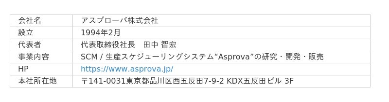 Asprovaは、1994年にアスプローバ社が開発した生産スケジューラです。多品種多工程の生産計画を超高速に作成し、工場の各設備や人員のスケジュールを秒単位の精度で作成し、実行可能な作業指示を計算してガントチャートで出力します。発売以来、国内外の幅広い製造業で採用され、順調に導入・利用社数を拡大しています。今後も生産スケジューリングのデジタライゼーションを支えるプラットフォームとして、機能とサービスの拡充を図ってまいります。(https://www.asprova.jp/products/overview.html)