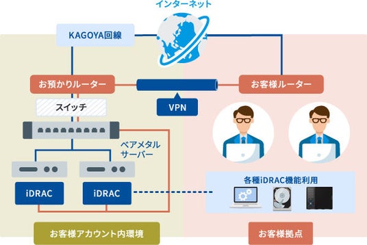 これにより、たとえばサーバーのネットワークがつながらなくなった場合でも、IPMI用のネットワークを経由で状態の確認や復旧操作が可能となります。また、従来は障害検知後の調査・復旧にあたり、当社に対し電源OFF/ON、リモートKVM、OS再インストールといった作業を依頼する必要がありましたが、お客様ご自身で遠隔操作できることから、復旧までの時間短縮も期待できます。