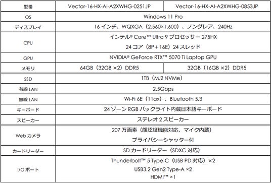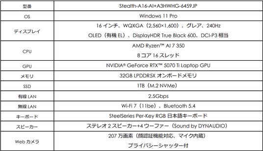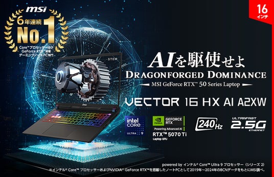 GeForce RTX(TM) 5070 Ti Laptop GPU搭載ゲーミングPC誕生「Vector 16 HX AI A2XW」「Stealth A16 AI+ A3HW」シリーズにラインアップ追加