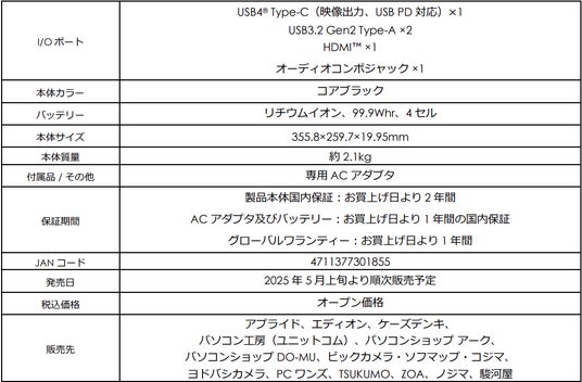●Core Ultra 9とRTX 5070 Tiを16インチサイズの本体に搭載したウルトラハイスペックモデル