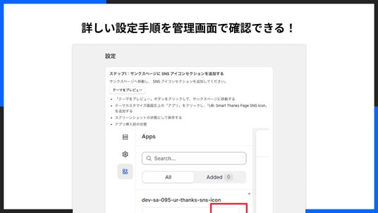 「サンクスページをカスタマイズしSNSアイコンを表示するアプリ」は、アプリの管理画面に、具体的な設定方法がわかりやすく掲載されています。サンクスページへアイコンを追加する手順や細かなオプションの説明を確認しながら、ストアに合わせたカスタマイズを行えます。