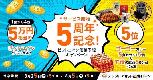 デジタルアセット担保ローンのサービス開始5周年を記念して「上位5名に特典をプレゼント!ビットコイン価格予想キャンペーン」を開催いたします。Xで4月15日9時時点のビットコイン価格を予想し、予想価格が近かった上位5名にビットコイン等の景品をプレゼントします。※諸条件あり