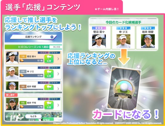 さらに、実際のトーナメントの順位を予想する「トーナメント予想」や、推し選手を応援カードで応援し、ランキングの上位にすることで新カードが実装される「応援」など、女子プロゴルフをもっと好きになるコンテンツが盛りだくさんです!