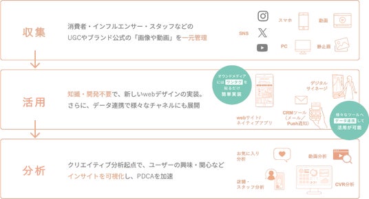 累計導入実績は900社を超え、エンゲージメント・CVR・回遊率・滞在時間の向上など、さまざまな課題解決に向けた機能を「収集・活用・分析」とAll in Oneで用意。事業者の課題に応じて「Instagram連携UGC活用」「動画接客」「スタッフ投稿」「ビジュアルコンテンツのAIレコメンド」「SNSのようなユーザー体験を提供できる各種テンプレート」を利用できます。