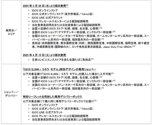 また、数量限定「IQOS ILUMA i ミネラ モデル」は日本先行発売の製品であり、今回の発売を記念して、3月26日(水)から、全国4店舗のIQOSストア※を特別仕様にて展開いたします。