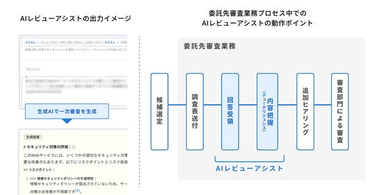 「AIレビューアシスト機能」を用いて、外部委託先企業などから回収したセキュリティチェックシートや委託先調査票の情報に対し、社内規程やプライバシーマーク、ISO認証などのフレームワークや社内文書を元に作成したRAG(検索拡張生成)を利用して、AI(人工知能)が審査部門に代わりサマライズし、リスク判定・レビュー業務を自動で行ないます。本機能を搭載した外部委託先審査システムの導入は、国内的にも先駆的な取り組みとなります。