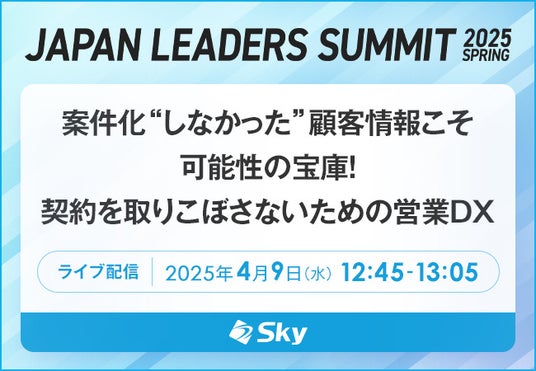 Sky株式会社は、2025年4月9日(水)~ 4月10日(木)に開催されるオンライン展示会「JAPAN LEADERS SUMMIT 2025 春(主催:スマートキャンプ株式会社)」にて、スポンサーとして協賛します。さらに、同イベント内で「案件化“しなかった”顧客情報こそ可能性の宝庫! 契約を取りこぼさないための営業DX」と題したセミナーを実施いたします。