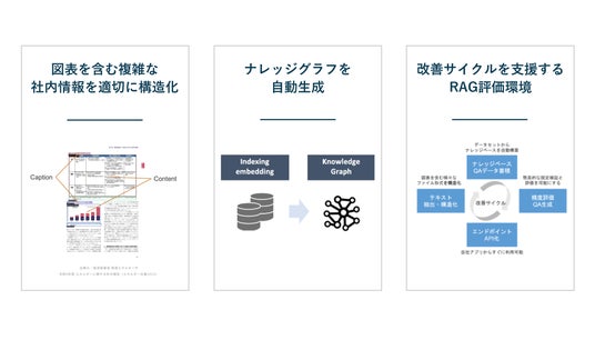 多機能AI(マルチモーダルLLM)を活用して、膨大な量かつ複雑なビジネスドキュメントのテキスト・図・表から情報を抽出。構造化データとナレッジグラフを自動生成し、RAGシステム検証を簡単に実行することができます。