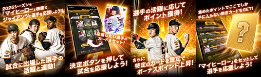 2025シーズンも公式戦全試合が対象となる「マイヒーロー」で選手たちを応援しましょう。マイヒーロー機能では、投手3名・野手3名のカードをセットすることで実際の試合の選手の活躍に応じてポイントを獲得できます。サポートカード枠を利用して監督やマスコットなど、選手以外のカードもセット可能です。ポイントを集めて、限定カードを手に入れましょう!