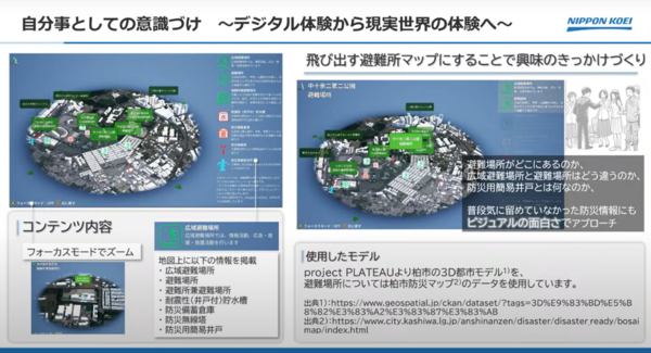 プレゼンでは、千葉県柏市にある柏の葉エリアをケーススタディにしたデモが動画で紹介された。同エリアは土地区画整理事業で開発された新しい区域で、県立公園や大学など国や県の施設が多く集まる地域。2011年からスマートシティモデル事業を推進している地区であるほか、生産年齢人口が増加する、まさに発展中の街として期待されている。そこで将来を担う子どもたちが、親と一緒に宝探しをするように避難所を見つけるという体でしつらえている。制作にあたっては、柏市の3D都市モデルおよび柏市防災マップのデータを使用している。