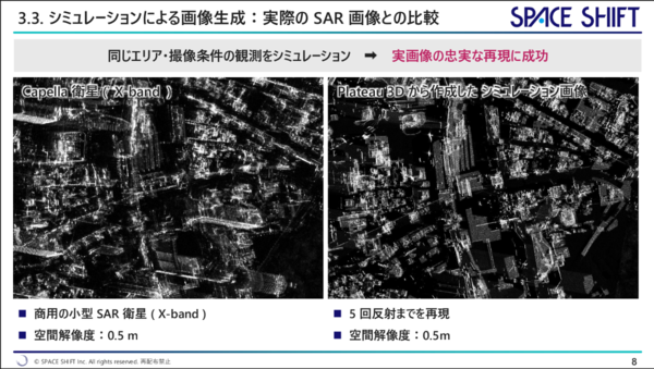 単純な画像生成ではSAR衛星画像の再現は難しいため、SARの特徴を考慮した3Dモデルの疑似観測により再現している。なお、シミュレーションの精度には3Dモデルの質が重要となる。その点、3Dモデルの測量の質が高いPLATEAUのデータにより十分な精度が得られるという。