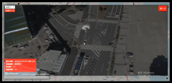 横浜市交通死亡事故3D体験マップは、警察庁が公開する交通事故統計情報と3D都市モデルを活用し、死亡事故の統計や事故情報、自動車や2輪車など事故車両への乗車を模擬的に体験できる機能を提供する。さまざまな事故データを統合し、3D可視化で事故の発生場所や状況を示すことで、市民の交通安全への理解を深め、安全運転やルール遵守の意識向上を目指すというものだ。