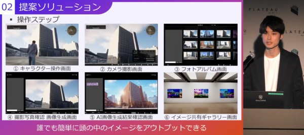 イメージ共有ツール Vision×Link(北村 駿季氏)。3D都市モデルを使ったゲーム内でキャラクターを操作し、任意の建物を撮影。撮影した画像を選択して、自分が思い描くイメージについて設定を行い、画像生成ボタンを押すのみでイメージをアウトプットできる