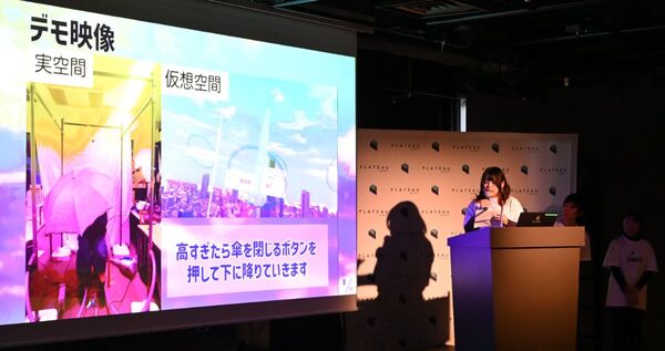 学生を対象としたPLATEAUユース賞はミヤタゲームズの「空傘散歩」が受賞した。空傘散歩はアニメや映画でよく描かれる「傘で空を飛ぶシーン」が体験できるVRコンテンツだ。体験者は映像表現と風覚装置から風の方向を知覚する。その風の方向に傘を傾けると実空間で傘が引っ張られるとともに、仮想空間では体が宙に持ち上がるというもの。