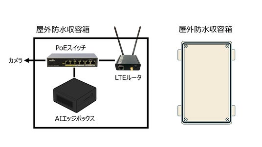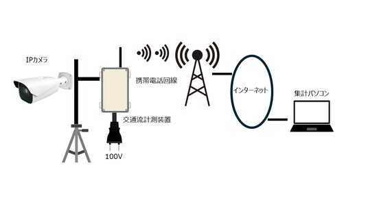 交通流計測装置には、AIによる交通流計測を行うAIエッジボックスおよびLTEルータが内蔵されており、AIにより計測された交通流は携帯電話回線を用いて集計パソコンに送られます。