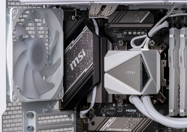 水冷CPUクーラーにはMSI「MAG CORELIQUID I360 White」を搭載。水冷ヘッドにはインフィニティミラーの意匠が施されていて、稼働時のイルミネーションは幻想的。360mmの水冷ラジエーターでCPUを強力に冷却してくれる頼もしいCPUクーラーだ。