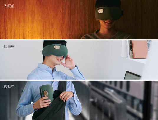 人間の耳には聞こえない、ハイレゾ音域を超える超高周波(ハイパーソニック)を含む15種類のサウンドと目元を温める温熱機能により、限られた時間で最大限のリフレッシュを実現することを目的としたアイマスクです。スマホアプリで好みのヒーリングサウンドを選択して5~20分過ごすことで、忙しい生活の合間でも短時間で心地よい休息をとることができます。