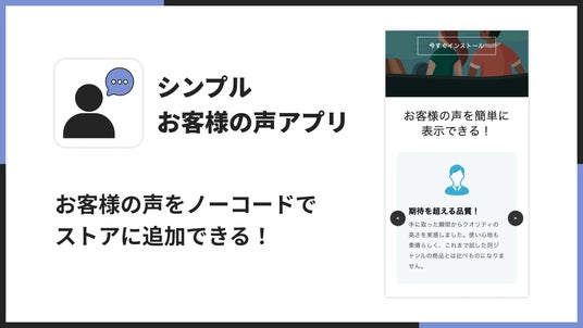 「シンプルお客様の声|お手軽ユーザーレビュー」は、ノーコードで簡単にお客様の声(レビュー)をストア内に挿入できる Shopify アプリです。実際に購入された方の声は、商品やブランドに対して大きな信頼感を与え、売上向上にも繋がる大変重要な要素です。本アプリを利用することで、誰でも手間なく短時間で洗練されたレビュー表示を実現できます。