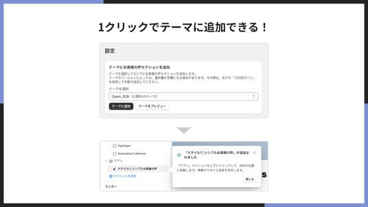 アプリ内でセクションを作成し「追加」ボタンを押すだけで、Shopifyのテーマエディタに反映。難しい設定やコード編集をすることなく、即座に新しいブロックとして活用できます。