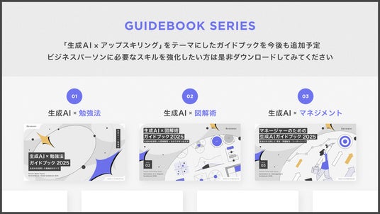 シリーズの第1弾では『生成AI × 勉強法ガイドブック 2025』、第2弾では『生成AI × 図解術ガイドブック 2025』を発表し、ビジネスパーソンに向けたさまざまな生成AIの活用方法を紹介してきました。これらの内容を紹介したnote記事は、500以上の「スキ」を集めるなど、多くの反響を呼んでいます。