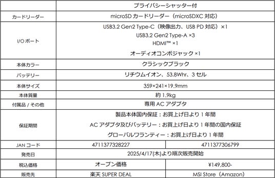 また、「“軽さ”ではなく“速さ”」コンセプトにしたビジネスノートPCの15.6インチモデル「Modern 15 H C13M」シリーズのバリエーションモデルを2025年4月17日(木)より順次発売いたします。