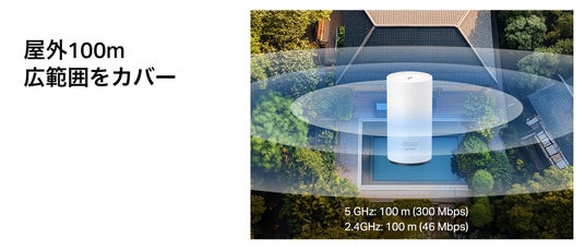 *8:Deco X50-Outdoorのスマートアンテナは、2.4GHz帯のみに対応しています。2.4GHzの偏波を調整し、隣接する周波数帯の周辺基地局からの干渉を回避します(Wi-Fi信号に対する障害物がない屋外での使用を想定)。実験室で行ったテストでは、5GHzで330Mbps、2.4GHzで46Mbpsの速度を記録しました。実際のカバレッジは使用する環境によって異なる場合があります。