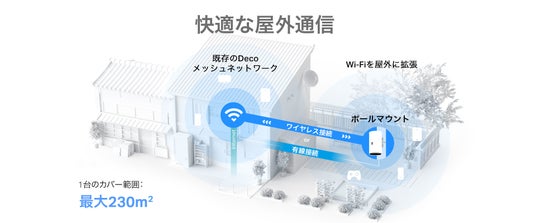「Deco X50-Outdoor」は、優れた耐環境性能と柔軟な設置・給電方法を備え、屋外でも快適な高速通信を実現します。1台で最大230平方メートル をカバーし、広範囲のWi-Fi環境を構築可能。さらに、全てのDecoシリーズと互換性があり、ユニットを追加するだけでシームレスにカバー範囲を拡張できます。