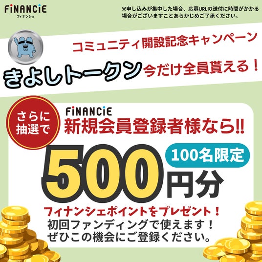 FiNANCiEアプリ新規会員登録なら、「きよしトークン」初回ファンディングで使えるフィナンシェポイント500円分を抽選でプレゼントします!