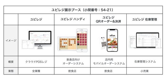 ユビレジの展示ブースでは、クラウドPOSレジ「ユビレジ」を中心に、飲食店向けオーダーシステム「ユビレジ ハンディ」、店内モバイルオーダーシステム「ユビレジ QRオーダー&決済」、在庫管理システム「ユビレジ 在庫管理」を実機でご体験いただけます。また、昨年7月に提供を開始した大規模導入向けサービス「ユビレジ エンタープライズ」のご紹介やご相談も展示ブース内で承ります。「人手不足への対応」「業務プロセスの標準化」「売上・顧客データの統合活用」といった課題に対して、ユビレジが提供する店舗DXの可能性をぜひ会場でご確認ください。
