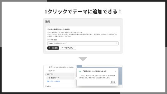 「シンプル動画埋め込み|お手軽どこでも動画挿入」では、動画埋め込みのためのアプリブロックを1クリックでテーマに追加できます。難しい操作は必要なく、誰でも簡単にアプリを始められます。