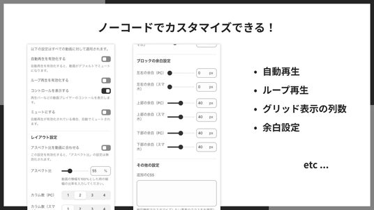 「シンプル動画埋め込み|お手軽どこでも動画挿入」では、自動再生やループ再生などの動画の再生設定からグリッド表示のレイアウトや余白設定などのデザイン設定まで、全てのノーコードでカスタマイズ可能です。