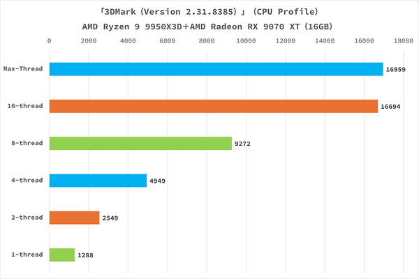 UL Benchmarksによると、16-threadのテストは、デジタルコンテンツ制作や3Dレンダリングなどの高い計算能力を必要とするタスクに向けたものという。つまり、クリエイティブ用途における「AMD Ryzen 9 9950X3D」の性能を推し量ることができ、この1万6000台というスコアは十分高いものだ。