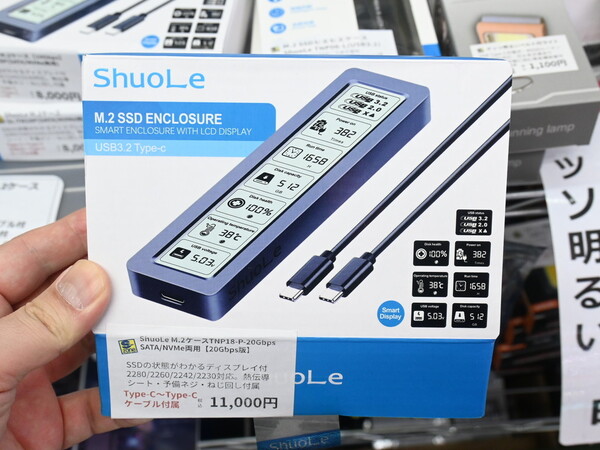 SSDの健康状態やリアルタイムの情報が把握できるディスプレーを搭載した、USB Type-C接続のM.2 SSD用ケース「SL-TNP18-P-20G」がShigezoneで販売中だ。ShuoLeブランドの製品で、価格は1万1000円。