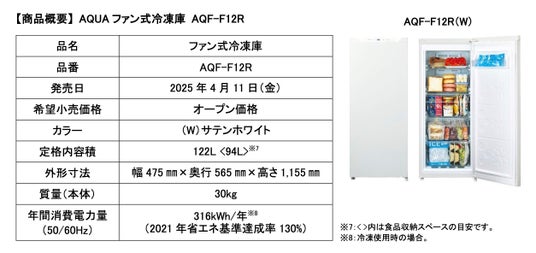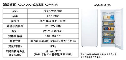 アクア株式会社(本社:東京都中央区、代表取締役社長 兼 CEO:杜 鏡国)は、冷凍・冷蔵の運転切替(※1)ができるファン式冷凍庫の新モデル「AQF-F13R」を、2025年4月11日(金)に発売します。