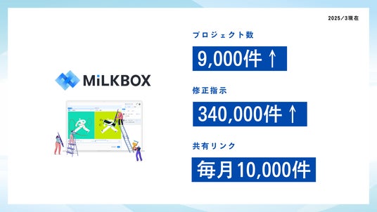 2025年3月、MiLKBOXのユーザー数が5,000名を突破しました。本リリースから約1年2ヶ月で、MiLKBOX内で立ち上げられたプロジェクト数は9,000件、その中で出された修正指示の件数は340,000件に達しており、多くのコミュニケーションをサポートしています。