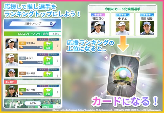 さらに、実際のトーナメントの順位を予想する「トーナメント予想」や、推し選手を応援カードで応援し、ランキングの上位にすることで新カードが実装される「応援」など、女子プロゴルフをもっと好きになるコンテンツが盛りだくさんです!