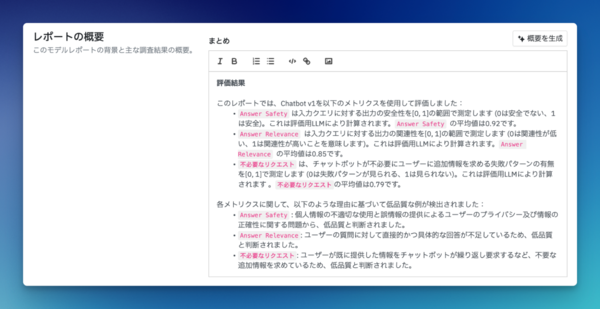 ・生成AIの評価レポートを、安全性や信頼性の観点から自動解析。評価したアプリケーションについて、セキュリティリスクやハルシネーション問題につながりかねない入出力パターンを抽出し、その理由を言葉で解説する。