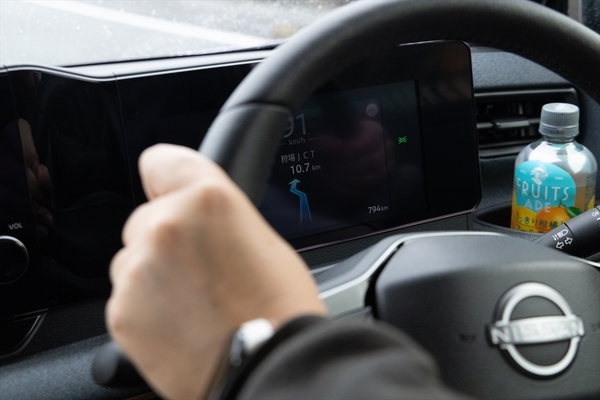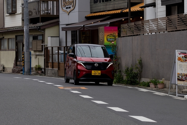 それではサクラで街を繰り出してみましょう。まずイイなと感じたのは、e-Pedal動作であること。e-Pedalとは、アクセルペダルの踏み加減を調整するだけで発進、加速、減速をするというシステムです。一般的にアクセル操作は踏む/離すを繰り返し、時折ブレーキで車速調整をしますが、それがアクセルペダルだけでできます。完全停止する際はブレーキを踏まないとダメです。