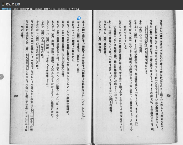 さっそく「なるへそ」で検索してみると、昭和10年頃の出版物において「なるへそ」が多く出てくるように見える。しかし、今回の検索において「なるへそ」が使われた最も古いと思われるものは、大正14年(1925年)の『さとことば』(幸田文時・著、非売品)という本である。