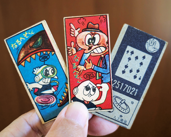 ということで、メルカリやヤフオクを探してみるとありました『なるへそくんカルタ』やら『なるへそくんメンコ』など。これはもう入手するしかないということで、入手したのが記事冒頭の写真のメンコである。『なるへそくん』の作者は、山根青鬼で、弟の山根赤鬼とともに、当時はなかなかの人気マンガ家でありました。
