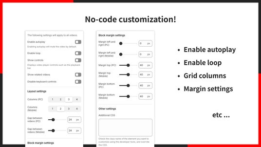 「UR: Smart YouTube Embed」では、自動再生やループ再生などの動画の再生設定からグリッド表示のレイアウトや余白設定などのデザイン設定まで、全てのノーコードでカスタマイズ可能です。