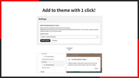 「UR: Smart YouTube Embed」では、YouTube 埋め込みのためのアプリブロックを1クリックでテーマに追加できます。難しい操作は必要なく、誰でも簡単にアプリを始められます。