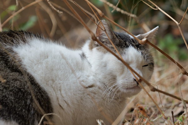 とある都内の公園の猫。どのアングルから狙っても手前に草がかぶってしまい、猫瞳AFの性能をチェックしろと言ってるようなもんだなと思いつつ狙ったのだけど、ちゃんと合ってました。エラい。