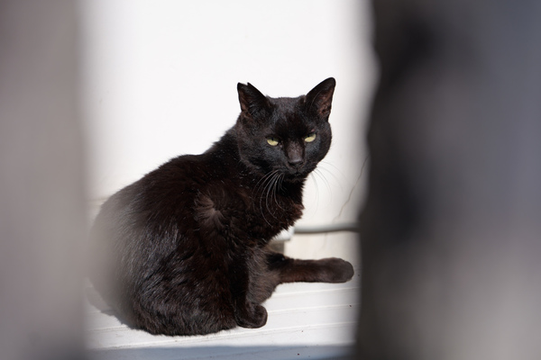最後の写真も、隙間からの猫。神社沿いを歩いていたら、玉垣の隙間に黒い怪しげなもふもふを発見。そっと覗いてみると、黒猫がエアコン室外機の上で日なたぼっこしていたのだ。