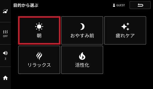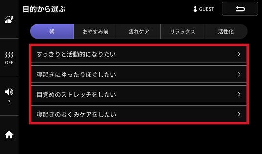 「目的から選ぶ」については、「朝」「おやすみ前」「疲れケア」「リラックス」などユーザーの置かれている状況別に、「寝起きにゆったりほぐしたい」「目覚めのストレッチをしたい」といった具体的なシーンを選択することで、おすすめのマッサージコースが開始されます。