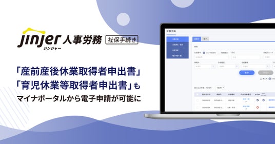 クラウド型人事労務システム「ジンジャー」を提供しているjinjer株式会社(本社:東京都新宿区、代表取締役社長:桑内 孝志)は、「ジンジャー人事労務 社保手続きオプション」にて、マイナポータルの電子申請可能な帳票として「健康保険・厚生年金保険産前産後休業取得者申出書/変更(終了)届」、「育児休業等取得者申出書(新規・延長)/終了届」もマイナポータル上から電子申請ができるようになったことをお知らせします。