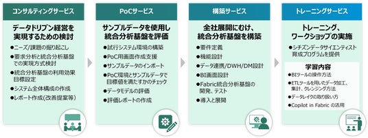 1. データ活用に必要な機能を統合した Microsoft Fabric を活用し、導入コンサルティングからPoC、構築、シチズン・データサイエンティストの育成トレーニングまで、企業のニーズに合わせたサービスメニューを提供