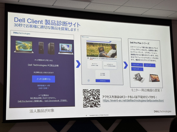 本発表会では、ユーザーが求めるおすすめ法人向けPCを見つけることができる「Dell Technologies PC製品診断」サイトを開設したことも発表。